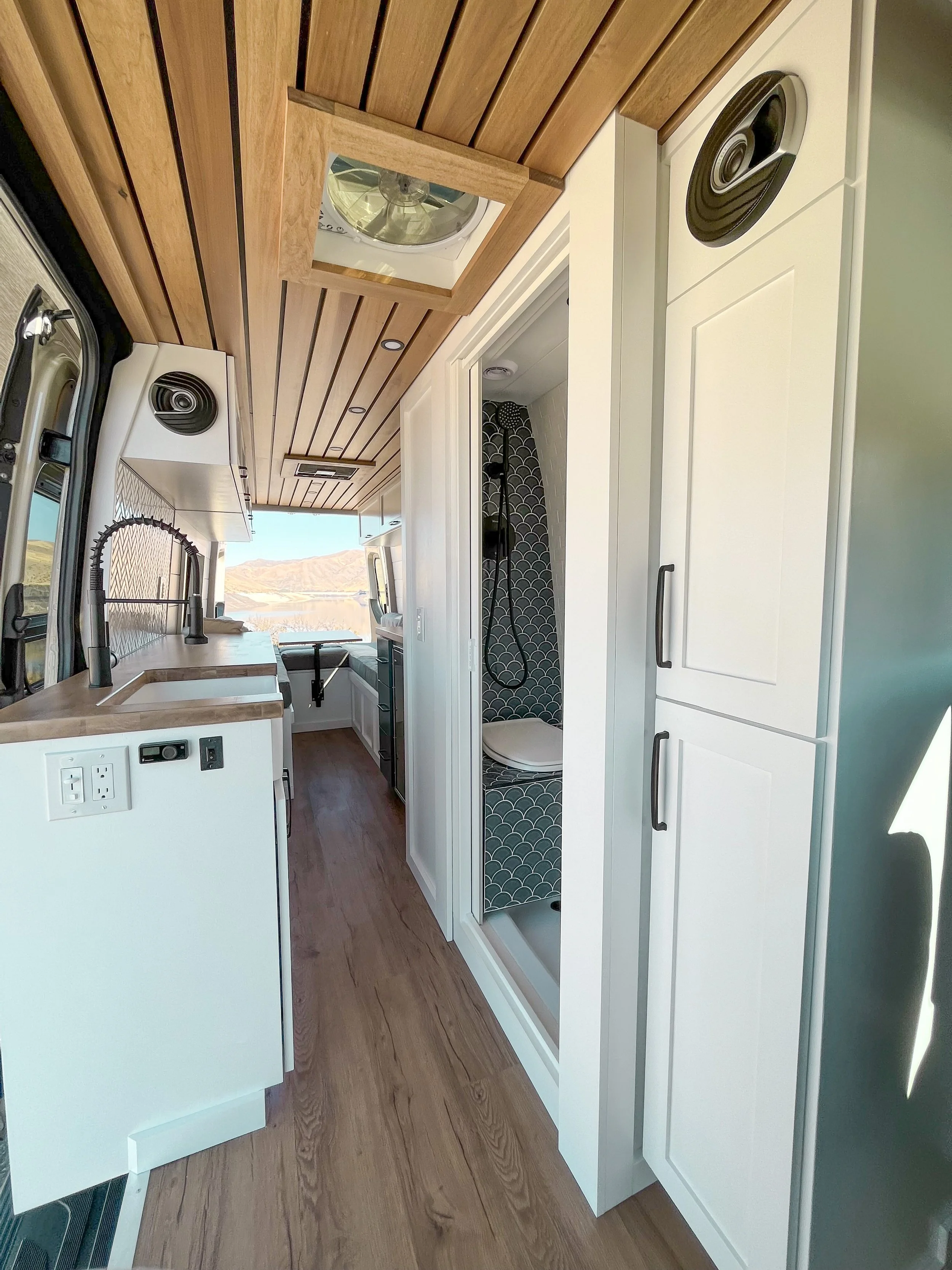 Some of our favorite features of this van are the custom milled poplar slat ceiling, the waterfall feature tile in the bathroom, the upgraded stereo system and the Dometic powered Awning.